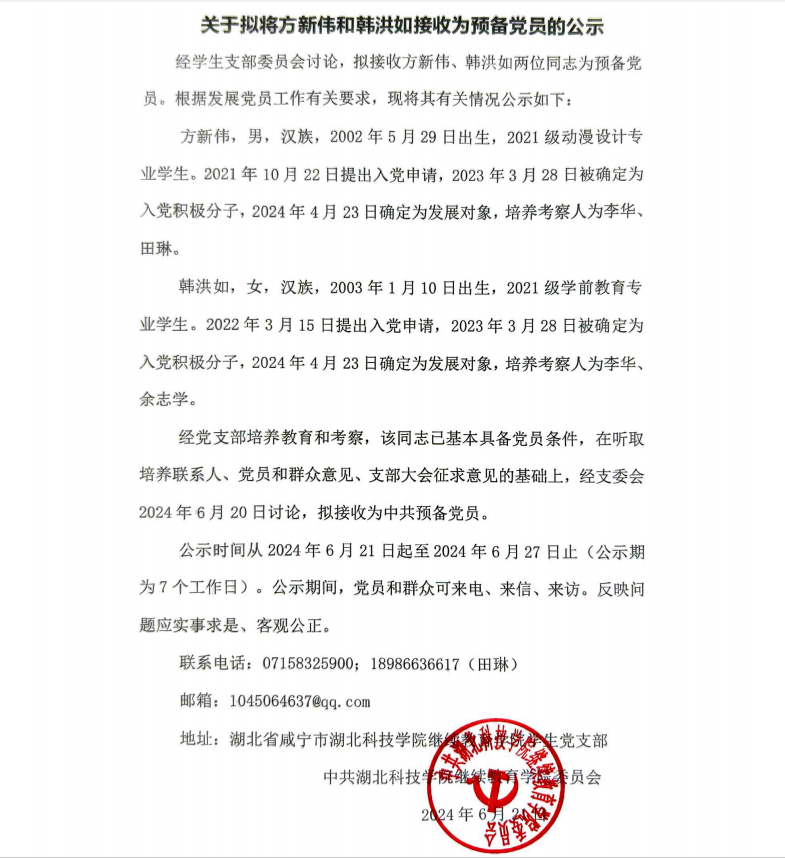 beat365官方网站学生支部关于拟将方新伟和韩洪如接收为预备党员的公示