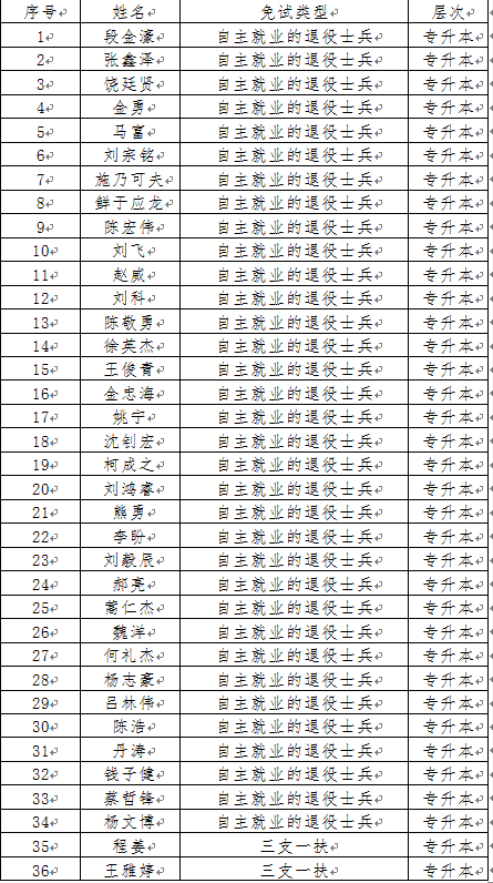 根据教育部和湖北省关于高校成人教育招生考试免试条件的有关文件规定和要求,退役军人免试条件是专科毕业且自主就业或者自主择业的考生,“三支一扶”条件是普通专科毕业且有“三支一扶”证明的考生。今年报考beat365的免试生有两种类型:退役军人和三支一扶考生。经beat365对考生材料初步审核,36名考生符合免试条件。现公示如下: